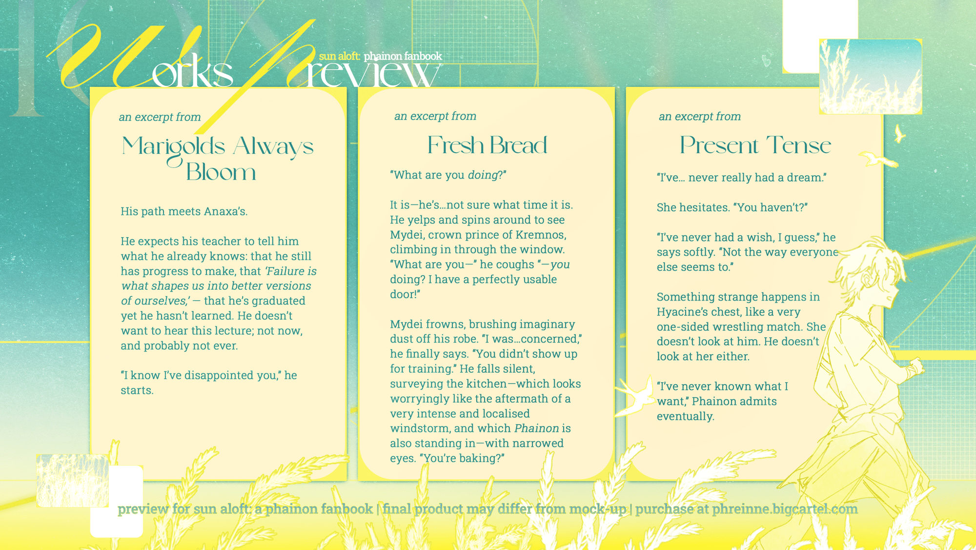 Sun Aloft is a Honkai: Star Rail fanbook centered on Phainon’s bonds and relationships, and consists of illustrations and fanfictions following the theme of halcyon days. This project is PG-16, contains 1 work with clearly romantic depictions with Mydei, and includes canon and alternate universe content.
